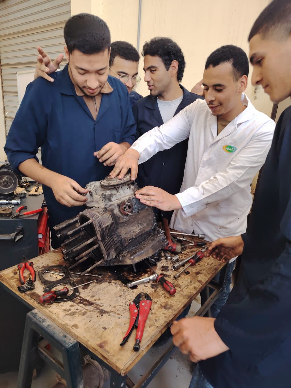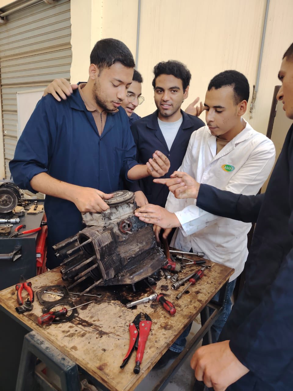 خلال التدريب العملي، يتعلم الطالب خطوات فك المحرك بطريقة صحيحة، مع مراعاة الترتيب الدقيق لفك الأجزاء المختلفة مثل رأس الأسطوانة، المكابس، عمود المرفق، وغيرها، مع الانتباه إلى وسائل الأمان والمحافظة على سلامة الأجزاء.
